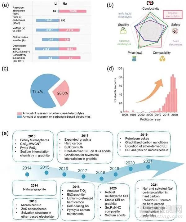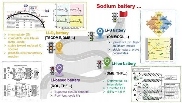 (e)醚類電解液在鈉離子電池應(yīng)用的重要工作路線圖。