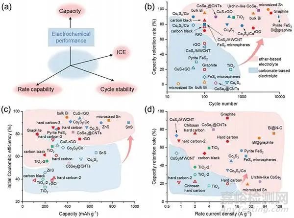 (a)電池電化學(xué)性能關(guān)鍵指標:容量、ICE、循環(huán)穩(wěn)定性和倍率性能;