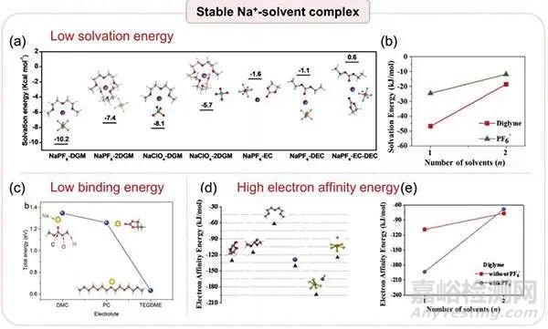 (d)不同溶劑、Na+、PF6-和NaPF6以及(e)Na+-DEGDME復(fù)合物(含/不含PF6)的電子親和能。