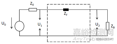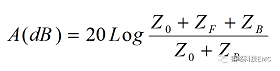 上面圖2是繞磁環(huán)等效電路,電路上的ZF是繞磁環(huán)后在電路上的等效阻抗,Z0是信號(hào)源的內(nèi)阻,ZB是負(fù)載,那么我們可以根據(jù)下面的公式計(jì)算出磁環(huán)的插入損耗,這樣就可以選出合適的磁環(huán)來(lái)降低噪聲滿足實(shí)驗(yàn)限值的要求。