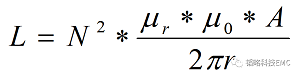 那么當(dāng)規(guī)格書(shū)上面沒(méi)有這樣的曲線時(shí),我們可以根據(jù)以下的公式進(jìn)行計(jì)算,當(dāng)磁環(huán)上繞了線之后我們可以將其等效成一個(gè)電感,其中N為繞線的匝數(shù),μr是磁環(huán)的磁導(dǎo)率,μ0是初磁導(dǎo)率,A是磁環(huán)的截面積,r是外圈到中心的半徑,因此根據(jù)公式可以計(jì)算出我們想要的磁環(huán)參數(shù)。