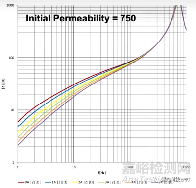 圖8是磁環(huán)內(nèi)部磁疇的分布情況,當(dāng)磁環(huán)沒(méi)有磁場(chǎng)時(shí)磁疇的分布是一個(gè)無(wú)序的狀態(tài),而施加磁場(chǎng)時(shí)磁疇變成一個(gè)有序的狀態(tài),那么電流增大時(shí)磁場(chǎng)強(qiáng)度也隨之增強(qiáng),這樣磁疇的排列就更加的緊湊,有序的磁疇更加的多,通過(guò)的磁感線就變得越密集,所以磁環(huán)的阻抗就隨之增大。由圖9的電流阻抗曲線可以看出,磁環(huán)的初始磁導(dǎo)率為750H/m時(shí),在低頻情況下電流由0安逐漸增加到5安,阻抗的差異會(huì)比較明顯,到高頻時(shí)電流變化時(shí)阻抗變化不大。