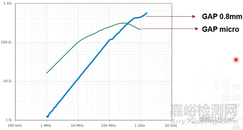 如圖10可以看出一款氣隙0.8mm的夾扣式磁環(huán)隨著頻率的不斷增加阻抗接近直線上升的趨勢(shì),到達(dá)上1GHz了阻抗還是增大狀態(tài)。而micro扁平磁環(huán)隨著頻率的增加會(huì)達(dá)到一個(gè)最高點(diǎn),頻率再增加時(shí)阻抗會(huì)下降,尤其是頻率達(dá)到1GHz的時(shí)候。因此在我們想要抑制高頻的噪聲時(shí)可以選擇夾扣式的磁環(huán)進(jìn)行抑制噪聲。