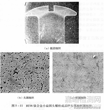 鈦合金組織對變形程度的影響非常明顯,如鈦合金螺栓墩制頭部后,在頭部和桿部將出現(xiàn)不同的組織特征。下圖給出了BT16鈦合金小扁圓頭螺栓成品件頭部和桿部的組織差異。螺栓頭部顯微組織為雙態(tài)組織,a相呈細顆粒狀,見下圖b,桿部顯微組織為雙態(tài)組織,α相呈細針狀,見下圖c。