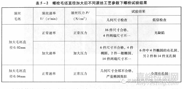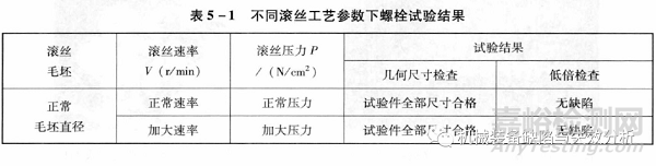 采用正常的滾絲毛坯直徑,經(jīng)正常滾絲壓力和速度、加大滾絲壓力和速度兩種工藝的試驗結果見下表: