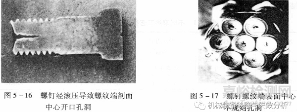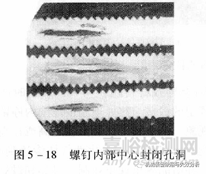 螺釘經(jīng)滾壓導致螺紋端剖面中心開口孔洞見圖5-16;螺釘螺紋端表面中心不規(guī)則孔洞洞見圖5-17;材料塑性好的螺釘出現(xiàn)的內(nèi)部中心封閉孔洞見圖5-18。