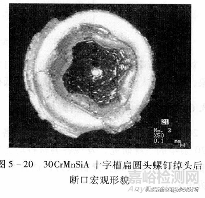 螺栓(釘)、螺母等緊固件采用鍛造或熱時,如果墩鍛溫度不當,如墩鍛加熱溫度低,容易產(chǎn)生裂紋,鍛造溫度高容易產(chǎn)生過燒。當鍛造溫度較低時,裂紋一般出現(xiàn)在變形量大或者應力最大厚度最薄的地方。這主要是由于這類裂紋通常是由于墩鍛時形成的較大拉應力、切應力或附加拉應力引起的。冷鎖變形量過大也將產(chǎn)生裂紋。例如,30CrMnSiA十字槽扁圓頭螺釘在裝配過程中螺釘從頭部斷裂,見下圖,失效分析結果表明,螺釘冷墩十字槽偏深導致在十字槽根部產(chǎn)生微裂紋并且對螺釘?shù)膹姸扔幸欢ㄓ绊懯锹葆數(shù)纛^的根部因。