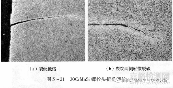 鍛造工藝不當或毛坯表面存在未清理干凈的氧化皮也同樣會導致折疊裂紋。這類折疊裂紋當經(jīng)過高溫后,對于鋼來說,一般裂紋兩側會出現(xiàn)脫碳的現(xiàn)象,而對于鈦合金來說則會出現(xiàn)富氧a層。圖5-21給出了30CrMnSi螺栓頭熱鍛成形導致的折疊裂紋及裂紋兩側的脫碳形貌。