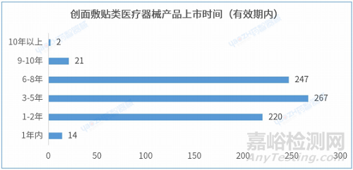 據(jù)統(tǒng)計,從產(chǎn)品進入市場的平均時間來看,在有效期內(nèi)的創(chuàng)面敷貼類醫(yī)療器械產(chǎn)品的上市時間在3-5年的產(chǎn)品數(shù)量最多,有267件。