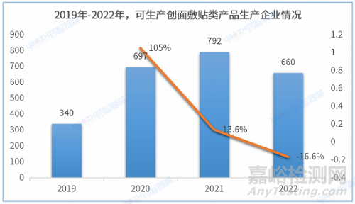 據(jù)統(tǒng)計,截至2022年底,全國可生產(chǎn)創(chuàng)面敷貼類醫(yī)療器械產(chǎn)品的生產(chǎn)企業(yè)有1642家。2021年注冊生產(chǎn)企業(yè)數(shù)量為近四年最多,有792家。
