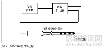 標準5.6.1 規(guī)定了高頻導通性的試驗方法。如圖1 所示,在頭端電極和手柄對應芯腳間通入400kHz±100kHz 的正弦試驗電流,該正弦信號通常由信號發(fā)生器產生,信號發(fā)生器連接功率放大器,調節(jié)放大器增益使試驗電流達到1A并保持1min。試驗期間電流應不發(fā)生中斷。1min后切斷試驗電流,等待導管冷卻至室溫后,使用萬用表測量導管的直流電流以判定是否符合要求。