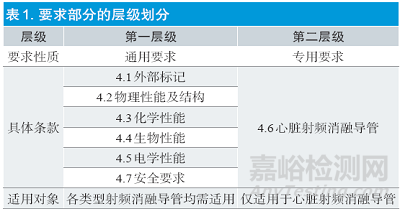 YY0778-2018的第4 章節(jié)“要求”部分是整個標準的核心章節(jié),包括4.1~4.7共7項要求。相較2010版的最大變化是,在適用對象方面,7 項要求可以分成兩個層級:第一層級為通用要求,第二層級為專用要求。如表1 所示,第一層級包括4.1 外部標記、4.2 物理性能及結構、4.3 化學性能、4.4 生物性能、4.5 電學性能以及4.7 安全要求共計6 項要求。這6項要求作為通用要求適用于各類型射頻消融導管,而不僅適用于某一特定類別的導管。第二層級為4.6 心臟射頻消融導管,該項要求適是心臟射頻消融導管的專用要求,僅適用于心臟射頻消融導管,其他類型的導管不需要執(zhí)行此條款。