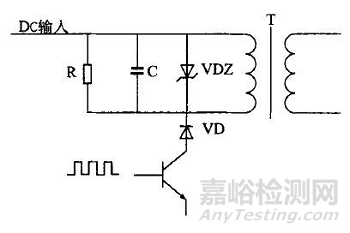 開關(guān)管或二極管在開通和關(guān)斷過程中,由于存在變壓器漏感和線路電感,二極管存儲電容和分布電容,容易在開關(guān)管集電極、發(fā)射極兩端和二極管上產(chǎn)生尖峰電壓。通常情況下采用RC/RCD吸收回路,RCD浪涌電壓吸收回路如圖2所示。