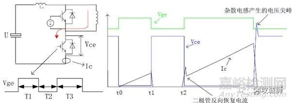 2、IGBT關(guān)斷大電流時(shí)候?qū)γ}沖寬度ton有一定依賴性,ton越小電壓尖峰V越高,且關(guān)斷電流拖尾會(huì)突變,發(fā)生高頻振蕩。