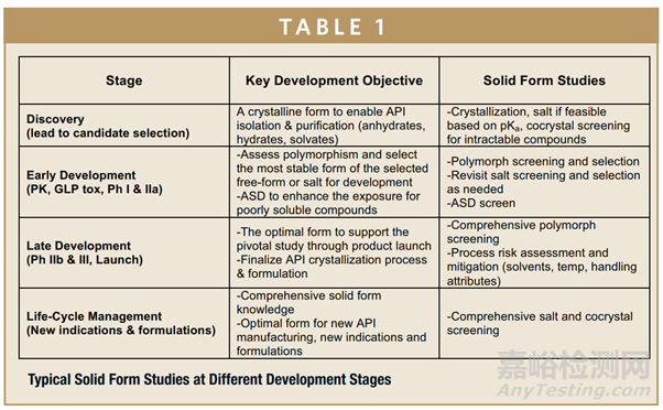 理想上是從一而終,現(xiàn)實仍然具有挑戰(zhàn),包括早期API的可及性,API開發(fā)工藝的不確定性以及API物理性質(zhì)的不斷轉(zhuǎn)變性等。每個候選藥物都是獨一無二的,但是,其固態(tài)形式確實多種多樣的,在藥物開發(fā)過程中選擇策略會有所不同。表1概述了在不同的開發(fā)階段,如何進行API固態(tài)研究以實現(xiàn)特定的開發(fā)目標。在早期階段,重點是確定合適的晶型以支持API的分離和純化,并為臨床前和臨床研究提供具有足夠溶解度和穩(wěn)定性的原料藥。隨著開發(fā)的進展,在后期階段會進行額外的研究,以評估和消除API和制劑生產(chǎn)過程中的固態(tài)形式風(fēng)險,以增加對固態(tài)形式的了解,并通過為新適應(yīng)癥和處方選擇最佳固態(tài)形式。下文我們談?wù)劰虘B(tài)形式轉(zhuǎn)變的幾種情形: