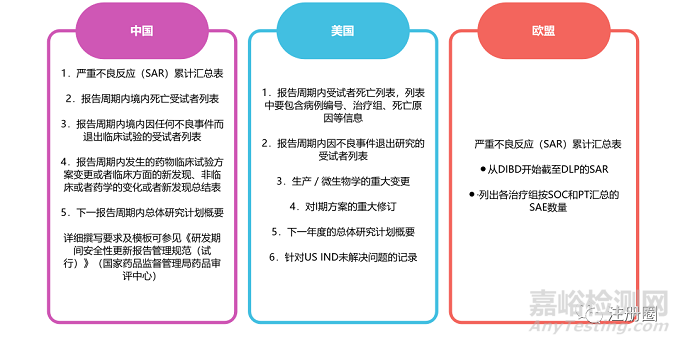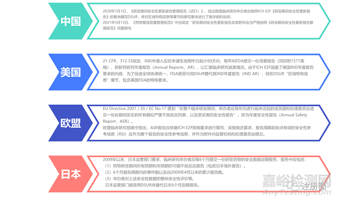 臨床研究申請人應(yīng)根據(jù)ICH E2F指南示例,并結(jié)合各區(qū)域特殊要求進(jìn)行DSUR的撰寫。下圖總結(jié)出區(qū)域特有信息相關(guān)要求。
