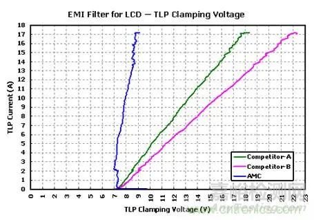 在靜電放電事件的高導(dǎo)通電流下,瞬時(shí)電壓抑制器的箝位電壓愈低則愈能適時(shí)地被導(dǎo)通,以提供受保護(hù)電路免于遭受靜電放電的侵害而永久受損失效。圖三所示,即為利用傳輸線觸波產(chǎn)生系統(tǒng)所量得的箝位電壓比較圖表。由圖表中可以清楚看到,晶焱科技所開發(fā)應(yīng)用于液晶顯示器的電磁干擾濾波器,在17安培的高靜電放電電流下,具有最低的箝位電壓,可以非常有效地提供受保護(hù)電路一個(gè)快速有效的靜電放電旁通路徑。