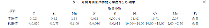 對開裂引漏管試樣進行化學成分分析,結(jié)果如表1所示。由表1可知:試樣的化學成分分析結(jié)果符合RCC M M3304—2007 《用于1,2級和3級設(shè)備的奧氏體不銹鋼鋼管(熱交換器管除外)》對Z2CND17-12鋼的要求。