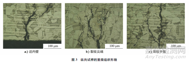 在試樣開裂部位制取縱向試樣,在光學顯微鏡下觀察,結(jié)果如圖3所示。由圖3可知:試樣的顯微組織為奧氏體,晶粒度均為6~8級,未見異常;近內(nèi)、外壁顯微組織未見明顯差異。試樣裂紋均由內(nèi)壁向外壁穿晶開裂,裂紋存在很多分枝,裂紋尖端多呈樹枝狀分叉,為應(yīng)力腐蝕裂紋的特征;外壁未見異常。