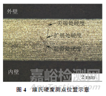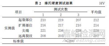 按照GB/T 4340.1—2009 《金屬材料 維氏硬度試驗 第1部分:試驗方法》對金相試樣進行維氏硬度測試,測點位置如圖4所示,測試結(jié)果如表2所示。由表2可知:試樣的硬度略高于GB/T 14975—2012對Z2CND17-12鋼的要求;裂紋附近及遠離裂紋處的硬度未見明顯差異。