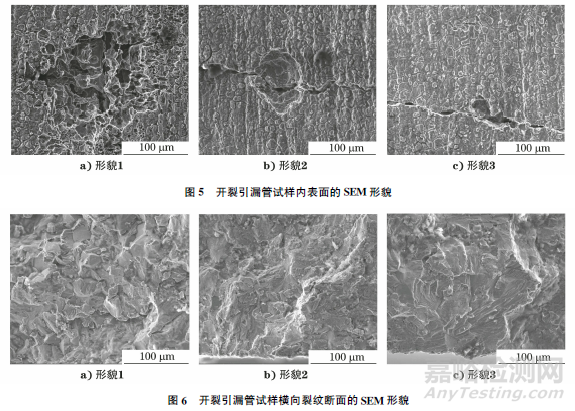 截取開裂引漏管試樣,其內(nèi)表面及橫向裂紋斷面的SEM形貌如圖5~6所示。由圖5~6可知:試樣內(nèi)表面存在腐蝕裂紋和腐蝕坑,腐蝕裂紋中充滿腐蝕產(chǎn)物,外表面未見異常;橫向裂紋打開后的裂紋斷面呈脆性穿晶開裂特征,無疲勞斷裂特征,裂紋面上有一層腐蝕產(chǎn)物。