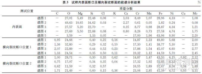 試樣內(nèi)表面斷口和橫向裂紋斷面的能譜分析位置如圖7所示,分析結(jié)果如表3所示。由表3可知:內(nèi)表面及橫向裂紋斷面均存在腐蝕性元素氯。