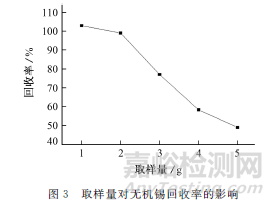 由圖3可知,無機錫的回收率隨取樣量的增加逐漸降低,取樣量為1,2g時的回收率相差不明顯;取樣量大于2g時,回收率顯著降低。為充分富集樣品中的無機錫,試驗選擇的取樣量為2g。