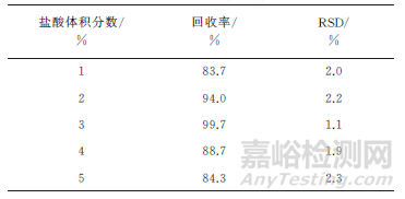 向比色管中分別加入不同量的鹽酸,再加入適量錫標準溶液及預還原劑,用0.01%曲拉通溶液稀釋,配制成不同體積分數(shù)的鹽酸,而錫質(zhì)量濃度均相同的5種錫標準溶液,每種標準溶液各配制6份,計算回收率和測定值的RSD,結果如表1所示。