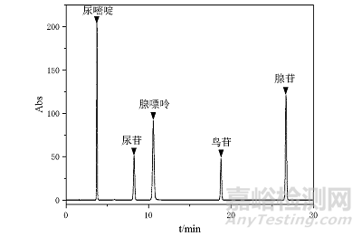 使用ZIC-cHILIC色譜柱,柱溫40°C,以乙腈-100 mmol/L甲酸銨水溶液為流動(dòng)相(90:10),流速0.4 mL/min,等度洗脫,檢測器為紫外檢測器,檢測波長為263 nm。色譜圖如圖5所示,15 min內(nèi)即可完成5種化合物的分析分離。