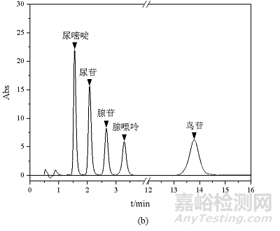 以核苷和堿基為例介紹親水相互作用色譜柱的使用方法。核苷和堿基分子中含多個(gè)N,O原子,分子結(jié)構(gòu)不對稱,分子有較大的偶極矩,極性較強(qiáng),難以溶解于普通有機(jī)溶劑,在普通C18色譜柱上幾乎沒有保留,定性定量分析存在較大困難。
