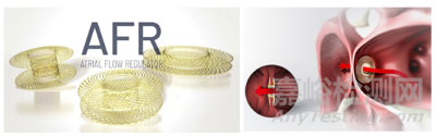 Occlutech公司的AFR心房流量調節(jié)器是一種鎳鈦合金網狀裝置,由兩個扁平圓盤和一個帶有中心開窗1~2 mm的連接頸組成,中心開窗可實現雙向流動,開窗尺寸為4、6、8 mm或10 mm,在房間隔造口術后經股靜脈入徑送入10~12F輸送系統,其最早設計用于肺動脈高壓晚期右心衰竭患者及Fontan術后靜脈循環(huán)衰竭患者。2021年1月,FDA對Occlutech AFR植入式心房流量調節(jié)器授予突破性醫(yī)療器械認定。