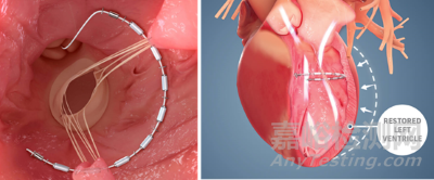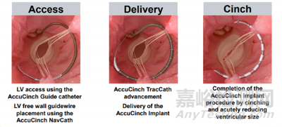 在AccuCinch系統手術過程中,導管通過主動脈瓣引導至左心室,將柔性植入物連接到左心室的內壁,然后用電纜連接錨將其收緊并鎖定到位。收緊后,左心室會減小,心室壁應力會減弱,心臟壁得到支持和加強。