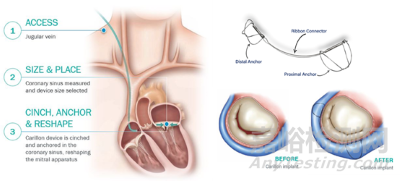 Carillon已經獲得CE批準用于治療二尖瓣反流,并且全球已經超過1500名患者接受Carillon治療,證明Carillon治療二尖瓣反流的有效性和安全性。本次EMPOWER臨床試驗,希望證明Carillon治療早期功能性二尖瓣反流(FMR)的心衰患者安全性和有效性。Carillon治療早期心衰原理有點類似與Ancora Heart的AccuCinch,通過糾正心臟維度方式改善心衰患者生活質量。AccuCinch通過重塑左心室來改善心衰癥狀,而Carillon通過收縮二尖瓣瓣環(huán),重塑左心室從而改善心衰癥狀。類似設備還包括Edwards Lifesciences的MONARC device。