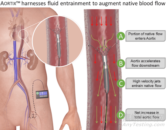 Aortix系統通過經皮介入的機械循環(huán)支持(pMCS)器械,手術置于在降胸主動脈,其微型旋轉泵位于鎳鈦諾支柱系統內,是一個直徑只有6mm,長度為6.5cm的經皮軸流泵,該設備通過18fr輸送系統經股入路部署,可提供高達5L/min的流量。血液從泵入口進入,加速,然后從泵出口流出,導致主動脈血流下行增加,可降低近心端主動脈阻力、增加遠心端主動脈流量,進而減輕左心室負荷,并增加腎臟灌注。Aortix類似于一個微型的抽水泵,利用流體夾帶來增加天然血流,從而導致血液流速加速,心臟輸出量增加,并減少心臟的工作量負荷。Aortix對患者心輸出量、尿量均有明顯改善,用于治療伴有心腎綜合征的急性失代償性心力衰竭。