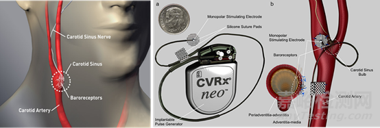 MobiusHD由Vascular Dynamics設計開發(fā)。頸動脈處的壓力感受器監(jiān)測動脈壁伸展的增加并向大腦發(fā)送信號,從而導致交感神經張力降低和副交感神經活動增加。因此可以通過對頸動脈竇壓力感受器的刺激,從而放大頸動脈竇壓力感受器的信號會反射性抑制交感神經活性,減輕心臟的工作負荷。