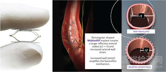 MobiusHD的植入物為一個自膨脹矩形鎳鈦合金支架,該植入物有3個型號,適用于5.00-7.00mm、6.25-9.00mm、8.00-11.75mm的血管。MobiusHD由輸送系統和植入物兩部分組成,MobiusHD是一個無源器械。它對通過物理壓迫方式刺激頸動脈竇壓力感受器,從而抑制交感神經活性。最終達到治療高血壓和心衰目的。