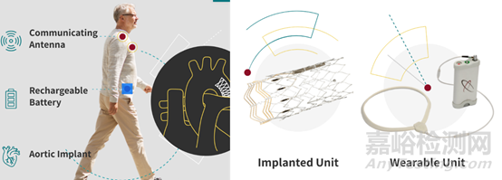 植入式支架裝置需要一個鎳鈦合金“類支架”植入物,設計靈活,其能夠向主動脈內壁提供電刺激。支架包含微型密封神經刺激器、接收射頻天線和專用電極。其本身無電池,通過接受無線可穿戴單元發(fā)出的射頻信號,實現對血管的刺激刺激。植入式裝置被部署在目標主動脈區(qū)域,通過使用傳統的二維血管造影投影檢測降主動脈上部電刺激引起的血壓降低來識別,就在左鎖骨下動脈的遠端。