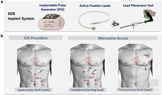 目前VisCardia開發(fā)出一種可植入的SDS治療系統-VisONE,該系統通過微創(chuàng)植入可在門診完成。該系統由一個可植入的脈沖發(fā)生器、適用于膈下放置的刺激/傳感導線和一個定制的手術輸送工具組成,整個過程通過腹腔鏡手術完成。