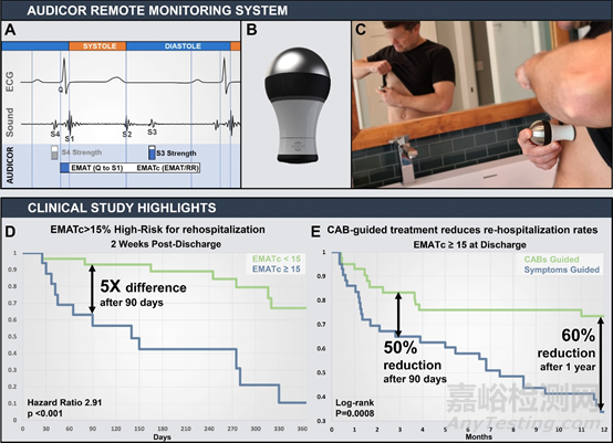 (A) Audicor CABs;(B) Audicor RPM recording device;(C)患者進行記錄。(D)(E) Kaplan-Meier曲線CAB = cardiac acoustic biomarkers; ECG = electrocardiography; EMAT = electromechanical activation time; EMATc = proportion of electromechanical activation time relative to cardiac cycle; S3 = third heart sound.