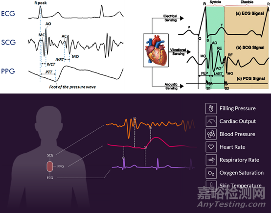 Cardiosense監(jiān)測平臺由CardioTag和機器學習技術組成,為心衰的血流動力學監(jiān)測提供了無創(chuàng)的選擇,未來可以更廣泛的應用于心衰人群中。Cardiosense測量心震圖(SCG)信號,它表示胸壁響應血液通過動脈樹的運動而發(fā)生的振動,以及心臟在胸部的運動。SCG由波浪組成,使用超聲心動圖作為參考標準,對應于主動脈瓣打開和關閉事件,以及血液快速射入主動脈。