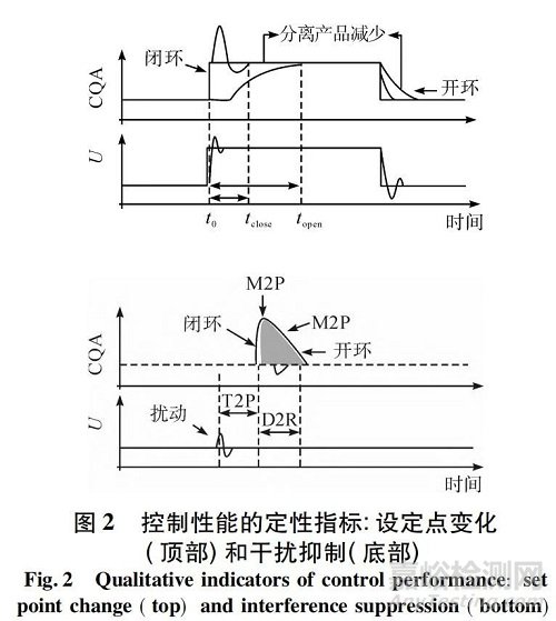 第 3 個指標,量積比( M2P) ,描述了在操作過程時CQAs 與目標設(shè)定點的最大偏差。重要的是要限制控制動作,以避免大的 M2P,從而使 CQA 保持在設(shè)計空間內(nèi)。圖 2 顯示了這些性能指標的定義,以及實施主動過程控制的潛在優(yōu)勢,與開環(huán)操作( 即手動或無需調(diào)整以維持 CQAs) 相比,這些標準定義了更好的性能。