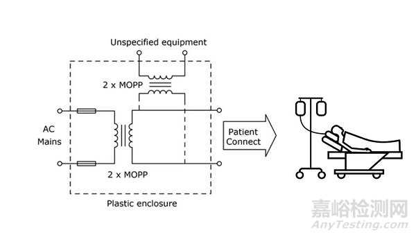 如果醫(yī)療設(shè)備要與患者電氣接觸同時(shí)連接其他未指定的設(shè)備,例如通過(guò)USB或LAN連接來(lái)監(jiān)控或記錄數(shù)據(jù)的話,接口的隔離等級(jí)就必須符合2 x MOPP。這樣一來(lái),如果未指定設(shè)備故障就不會(huì)導(dǎo)致電流經(jīng)由設(shè)備流向患者。醫(yī)院設(shè)備的情況也一樣,BF(和 CF)應(yīng)用器件必須與任何可能的接地進(jìn)行隔離,比如通過(guò)電纜屏蔽連接到其他未指定的設(shè)備。這是為了防止危險(xiǎn)的電流從其他有故障的、未指定的電氣設(shè)備流過(guò)患者和設(shè)備然后流向接地。