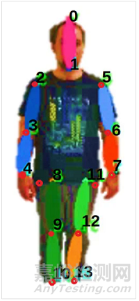 圖1 運(yùn)動(dòng)期間記錄的人體中14個(gè)點(diǎn)的位置:0.頭部;1.下巴;2、右肩關(guān)節(jié);3、右臂肘關(guān)節(jié);4、右手腕關(guān)節(jié);5.左肩關(guān)節(jié);6、左臂肘關(guān)節(jié);7.左腕關(guān)節(jié);8、右側(cè)髖關(guān)節(jié);9、右腿膝關(guān)節(jié);10.右腿踝關(guān)節(jié);11.左側(cè)髖關(guān)節(jié);12.左腿膝關(guān)節(jié);和 13.左踝關(guān)節(jié)