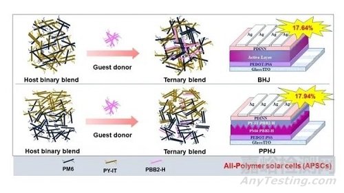 此外,共軛聚合物之間的強鏈間纏結(jié)易形成較差的相分離、低混合熵,難以調(diào)控活性層的結(jié)晶和形貌,進而限制光伏性能的提升。對此,科研人員開發(fā)的具有良好混溶性的聚合物給體,可以有效滲透到給/受體(D/A)聚集域中,優(yōu)化了全聚合物活性層內(nèi)的分子堆積和相分離,實現(xiàn)了激子和載流子的高效利用(圖2)。具有體異質(zhì)結(jié)(BHJ)結(jié)構(gòu)的三元APSC實現(xiàn)了17.64%的效率和高的厚膜耐受性。第三組分滲透可有效地促進更多混合相的形成,并獨立地優(yōu)化D/A有序堆積,在構(gòu)建理想偽平面異質(zhì)結(jié)(PPHJ)活性層方面顯示出獨特的優(yōu)勢。具有PPHJ結(jié)構(gòu)的三元APSC獲得了17.94%的效率并表現(xiàn)出優(yōu)異的器件穩(wěn)定性。利用良好混溶性第三組分獨立誘導(dǎo)D/A有序堆積,在構(gòu)建高性能APSC方面頗具潛力。相關(guān)成果發(fā)表在《能源與環(huán)境科學》(Energy & Environmental Science)上。