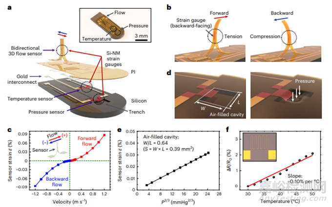傳感模塊由硅納米膜制成,尺寸僅為3.0 mm × 8.0 mm × 2.3 mm,這是為了方便植入和與其他植入設(shè)備相結(jié)合。模塊上設(shè)置了測量血流量的傳感器(圖2b),測量壓力的傳感器(圖2d)和測量溫度的傳感器(圖2f),用于采集數(shù)據(jù)。