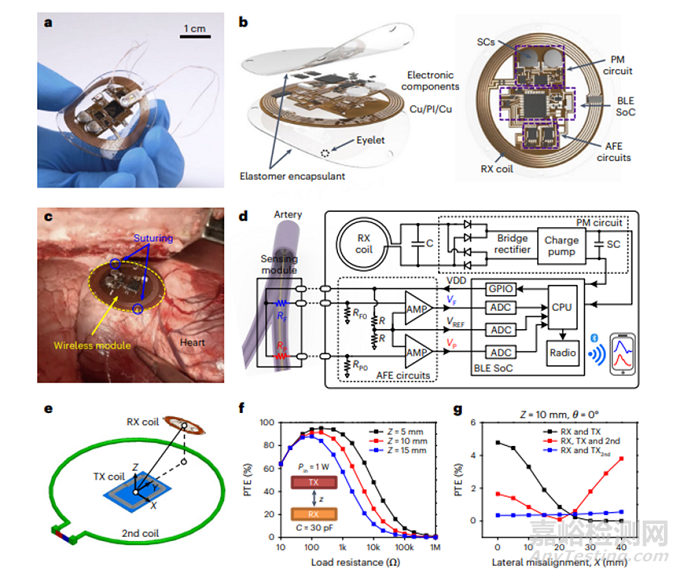 無線電子模塊主要用于實現(xiàn)兩項功能。一是為整個內(nèi)部系統(tǒng)供電。由于電池供電的植入物壽命有限,需要通過手術(shù)來更換或給電池充電,且具有一定的風(fēng)險性。因此研究團隊放棄了電池供電的設(shè)計,使用WRT系統(tǒng)來為整個內(nèi)部系統(tǒng)無線供電。(圖3d中的RX線圈)。二是實現(xiàn)數(shù)據(jù)傳輸。體內(nèi)部分傳感器的電阻數(shù)據(jù)由AFE電路進行處理(圖3d中的AFE電路),然后通過BLE無線傳輸?shù)酵獠康娘@示設(shè)備。(圖3d中的BLE SoC)。另外由于兩模塊之間通過柔性導(dǎo)線相連,因此只需要傳感器進入到血管部分,無限電子模塊可以位于體表淺層部分。