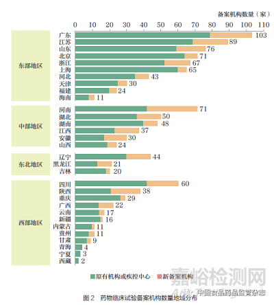 以2021 年12 月31 日前在藥物臨床試驗(yàn)機(jī)構(gòu)備案管理信息平臺(tái)[5] 備案的藥物臨床試驗(yàn)機(jī)構(gòu)為研究對(duì)象,其中新備案機(jī)構(gòu)定義為在備案前未取得國(guó)家藥品監(jiān)管部門會(huì)同國(guó)家衛(wèi)生健康主管部門資格認(rèn)定的藥物臨床試驗(yàn)機(jī)構(gòu),原有機(jī)構(gòu)定義為此前取得過(guò)國(guó)家藥品監(jiān)管部門會(huì)同國(guó)家衛(wèi)生健康主管部門資格認(rèn)定且已進(jìn)行備案的藥物臨床試驗(yàn)機(jī)構(gòu)。同時(shí),本研究匯總了2020年1 月1 日至2021 年12 月31日期間在藥物臨床試驗(yàn)登記與信息公示平臺(tái)[6] 上登記的藥物臨床試驗(yàn),重點(diǎn)分析新備案機(jī)構(gòu)開(kāi)展藥物臨床試驗(yàn)的情況。