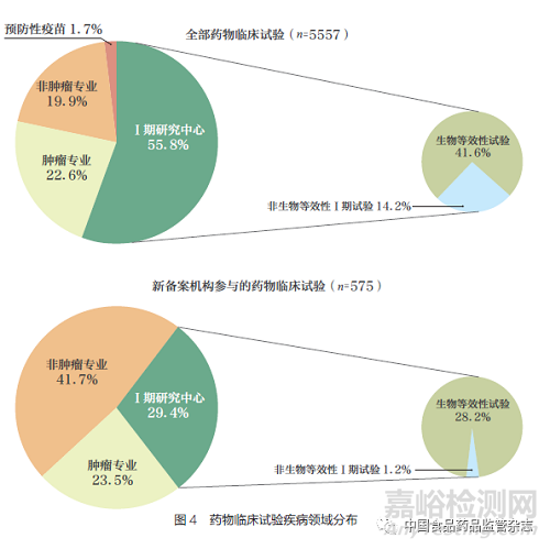 目前新備案機(jī)構(gòu)承接的試驗(yàn)類型和疾病領(lǐng)域均與原有機(jī)構(gòu)存在一定差距。雖然新備案機(jī)構(gòu)承接的試驗(yàn)與全部試驗(yàn)中抗腫瘤試驗(yàn)的占比相似(圖4),但新備案機(jī)構(gòu)Ⅰ期研究中心承接的試驗(yàn)數(shù)量明顯少于平均水平(29.4% vs 55.8%),且以生物等效性試驗(yàn)為主。非生物等效性試驗(yàn)的Ⅰ期臨床試驗(yàn)中僅有1.2% 的項(xiàng)目選擇納入新備案機(jī)構(gòu)。此外,中藥/天然藥物項(xiàng)目?jī)H占全部藥物臨床試驗(yàn)數(shù)量的2.4%,但新備案機(jī)構(gòu)參與程度超過(guò)25%。值得注意的是,國(guó)內(nèi)試驗(yàn)和國(guó)際多中心試驗(yàn)在新備案機(jī)構(gòu)的選擇比例方面并未出現(xiàn)明顯區(qū)別,分別為10% 和9%。這對(duì)新備案機(jī)構(gòu)積累研究經(jīng)驗(yàn),加速藥物研發(fā)規(guī)范化、國(guó)際化進(jìn)程起到了積極的作用。