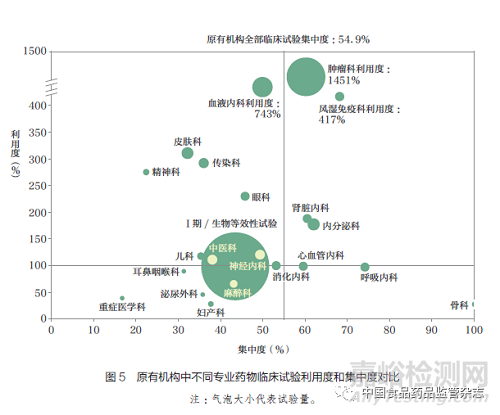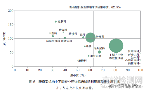 利用度為100% 意味著平均每家機(jī)構(gòu)任一時(shí)間有且僅有一個(gè)正在進(jìn)行的臨床試驗(yàn)項(xiàng)目,利用度大于100% 代表平均每家機(jī)構(gòu)特定專業(yè)有多項(xiàng)臨床試驗(yàn)同時(shí)開(kāi)展,而小于100% 則說(shuō)明臨床試驗(yàn)項(xiàng)目間存在空檔。
