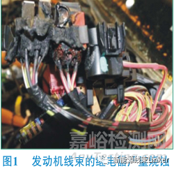 根據(jù)現(xiàn)場專業(yè)科室的反饋,該車輛經(jīng)C-NCAP 64 km/hODB碰撞后無明顯異常,經(jīng)過一晚靜置,第2天早上發(fā)現(xiàn)車輛無法KL15(點(diǎn)火開關(guān)轉(zhuǎn)至ON擋)上電,經(jīng)檢查發(fā)現(xiàn)發(fā)動機(jī)艙發(fā)動機(jī)線束的繼電器嚴(yán)重?zé)g,如圖1所示。